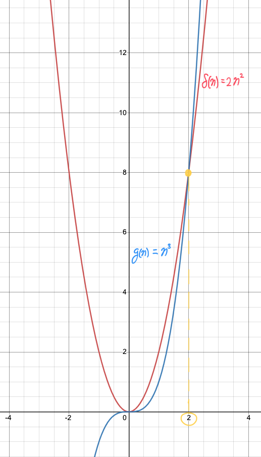 예시로, 아래의 그래프를 통해 $c = 1, \ n_0 = 2$ 라는 조건 하에 $2n^2 = O(n^3)$ 이라는 결과를 도출할 수 있다.
