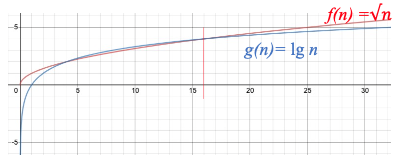 예시로, 아래의 그래프를 통해 $c = 1, \ n_0 = 16$ 이라는 조건 하에$\sqrt n = \mathsf{\Omega}(lg \ n)$ 이라는 결과를 도출할 수 있다.