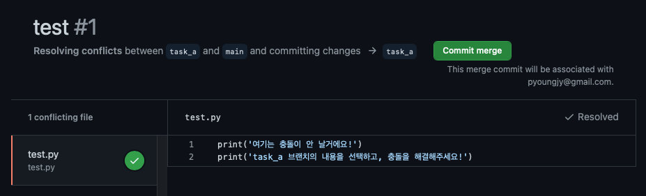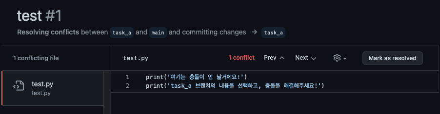 선택할 브랜치의 내용을 고르면, Mark as resolved 버튼이 활성화됩니다.