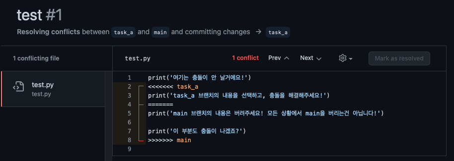 여러 작업을 하고 PR을 요청하니, conflict 가 나는 경우도 생길 수 있습니다.