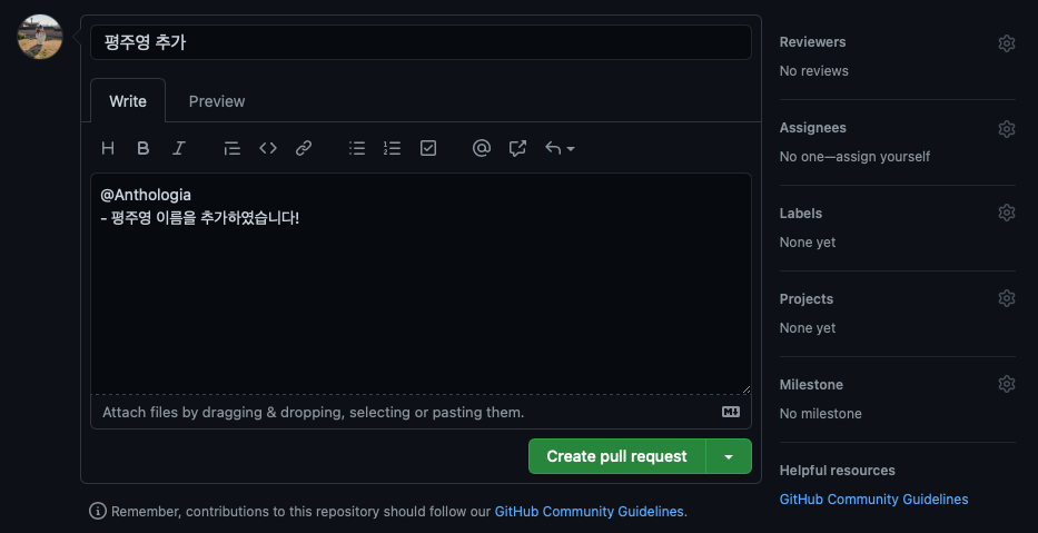 - Reviewers 는 특정 사람에게 해당 PR에 대한 리뷰를 요청하고 싶은 경우 추가합니다!