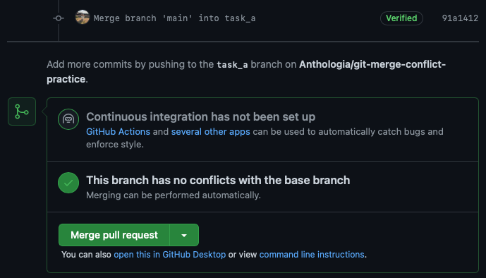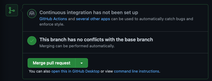 알림과 함께 Merger pull request 버튼 역시 활성화가 됩니다!