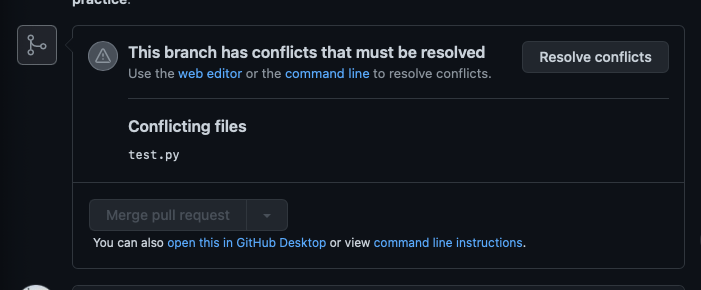 그러면 아래와 같이 알람이 뜨는데요! 해결을 위해 Resolve conflicts 를 눌러줍시다.